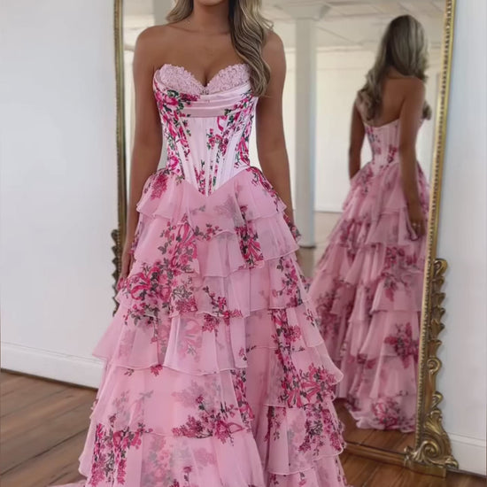 A-Line/Princess Floral Blush Tiered Chiffon Long Corset Prom Dress with Slit